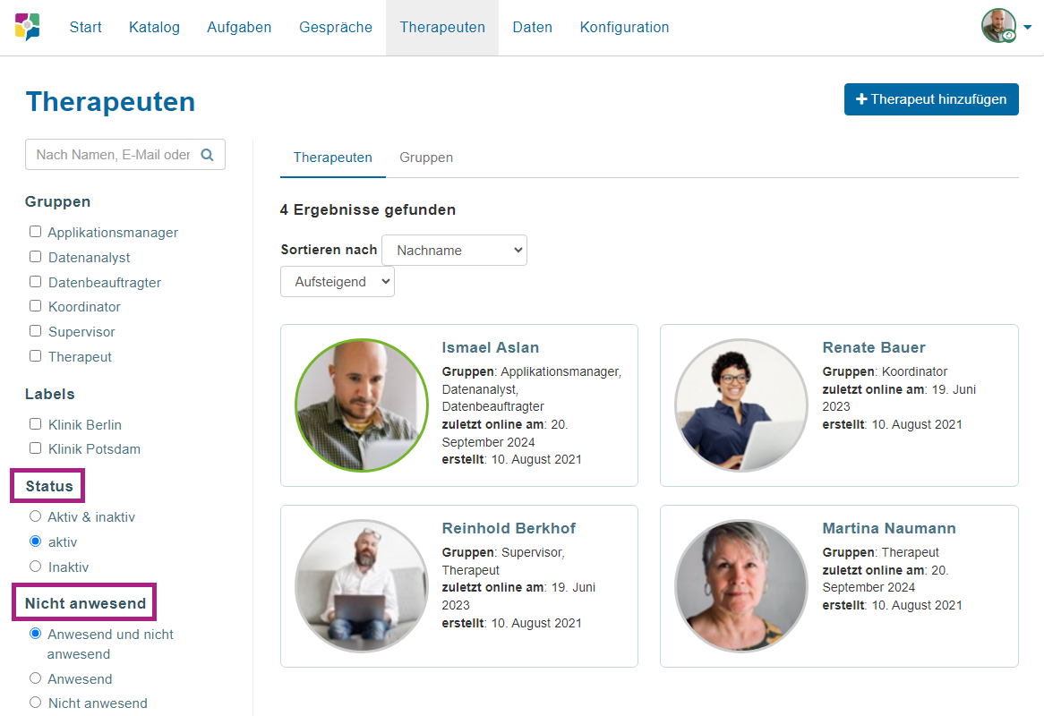 Außerdem, wenn Werkzeuge immer noch von dem Therapeuten betreut werden, führt dies zu Fehlern im Klientenkonto. Durch das Löschen eines Therapeutenkontos werden diese Werkzeuge/Konten plötzlich auf unbetreut gesetzt.